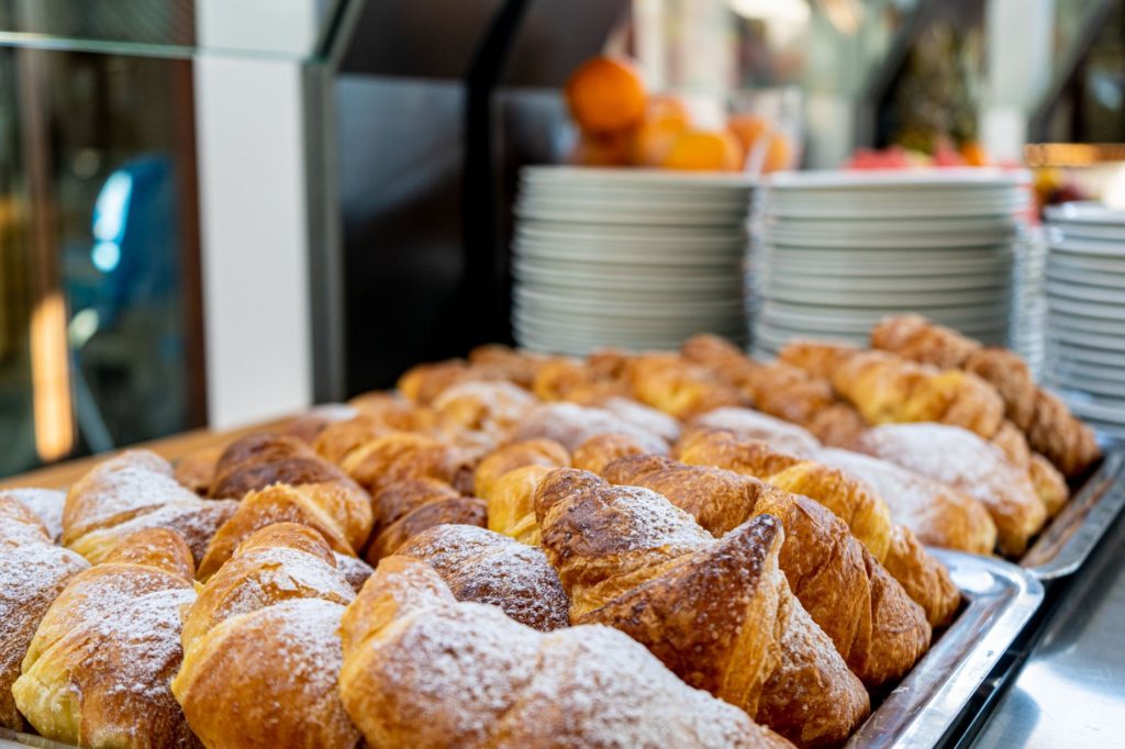 pane/fette biscottate – burro – marmellata –- 1 brioches – latte – caffè – thè o cioccolata